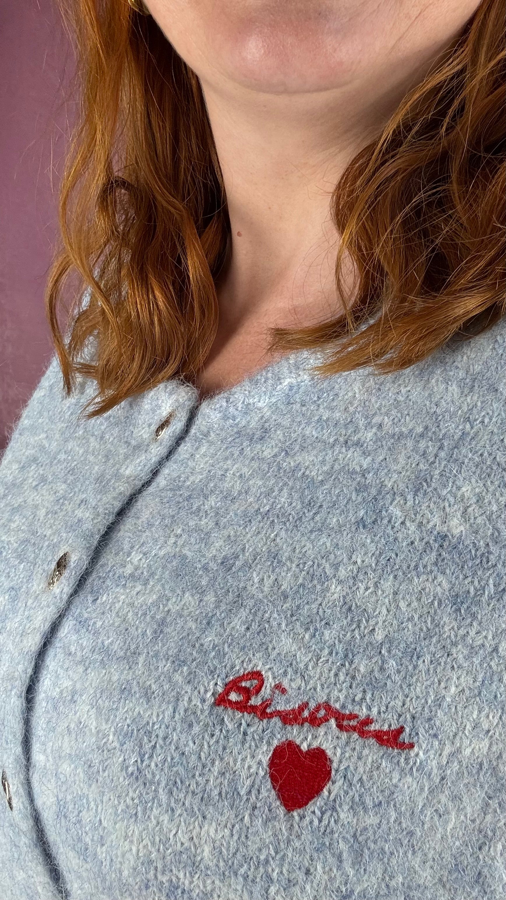 Deze bisous cardigan is een tijdloze klassieker met een zachte, vrouwelijke twist. De hoorn-effect knopen en het subtiele Bisou-borduursel aan de hartzijde zorgen voor een cozy maar elegante uitstraling.