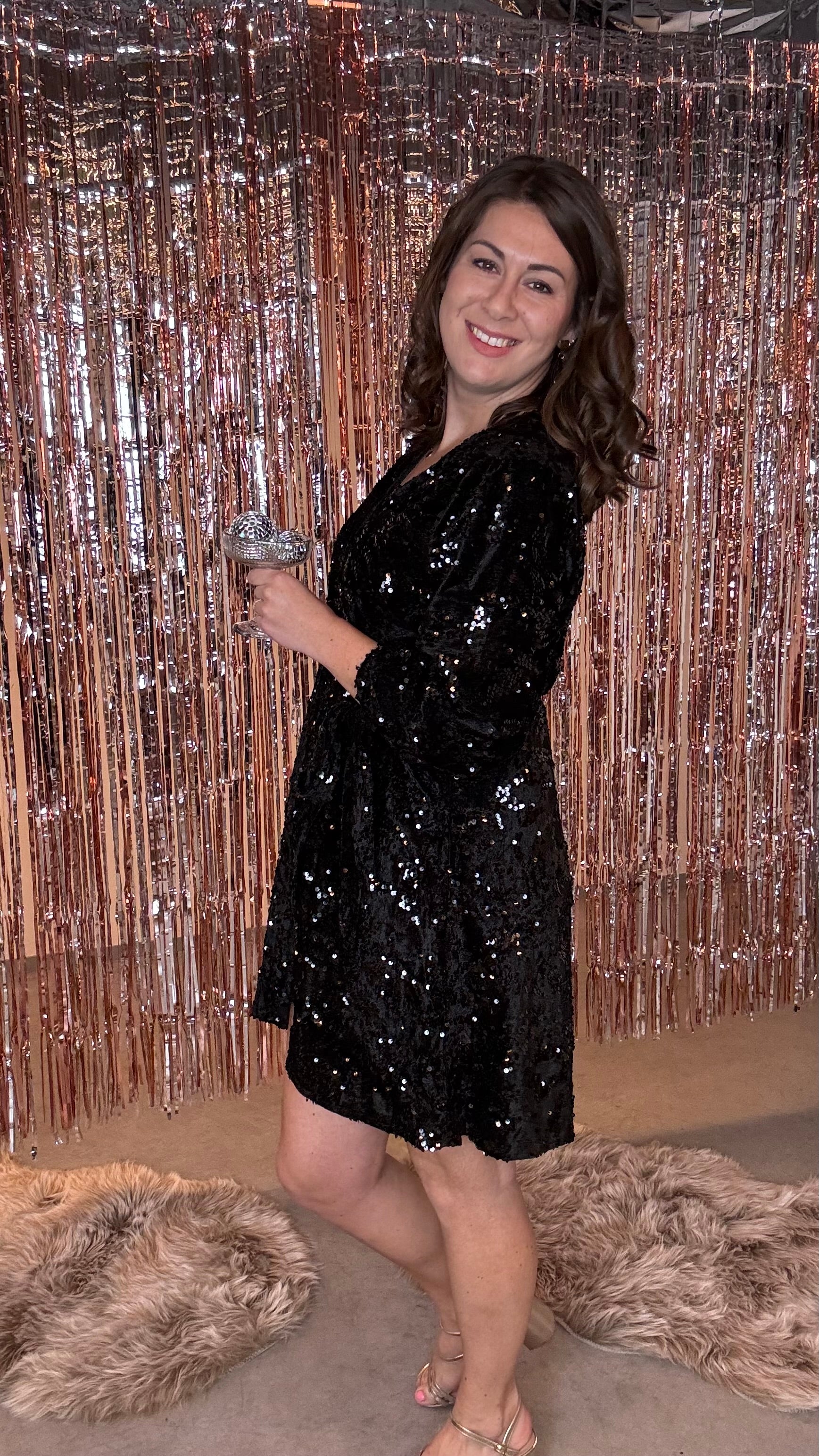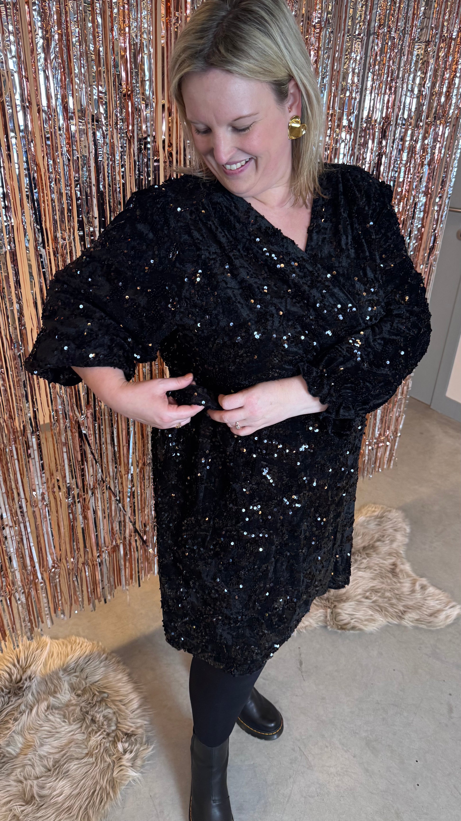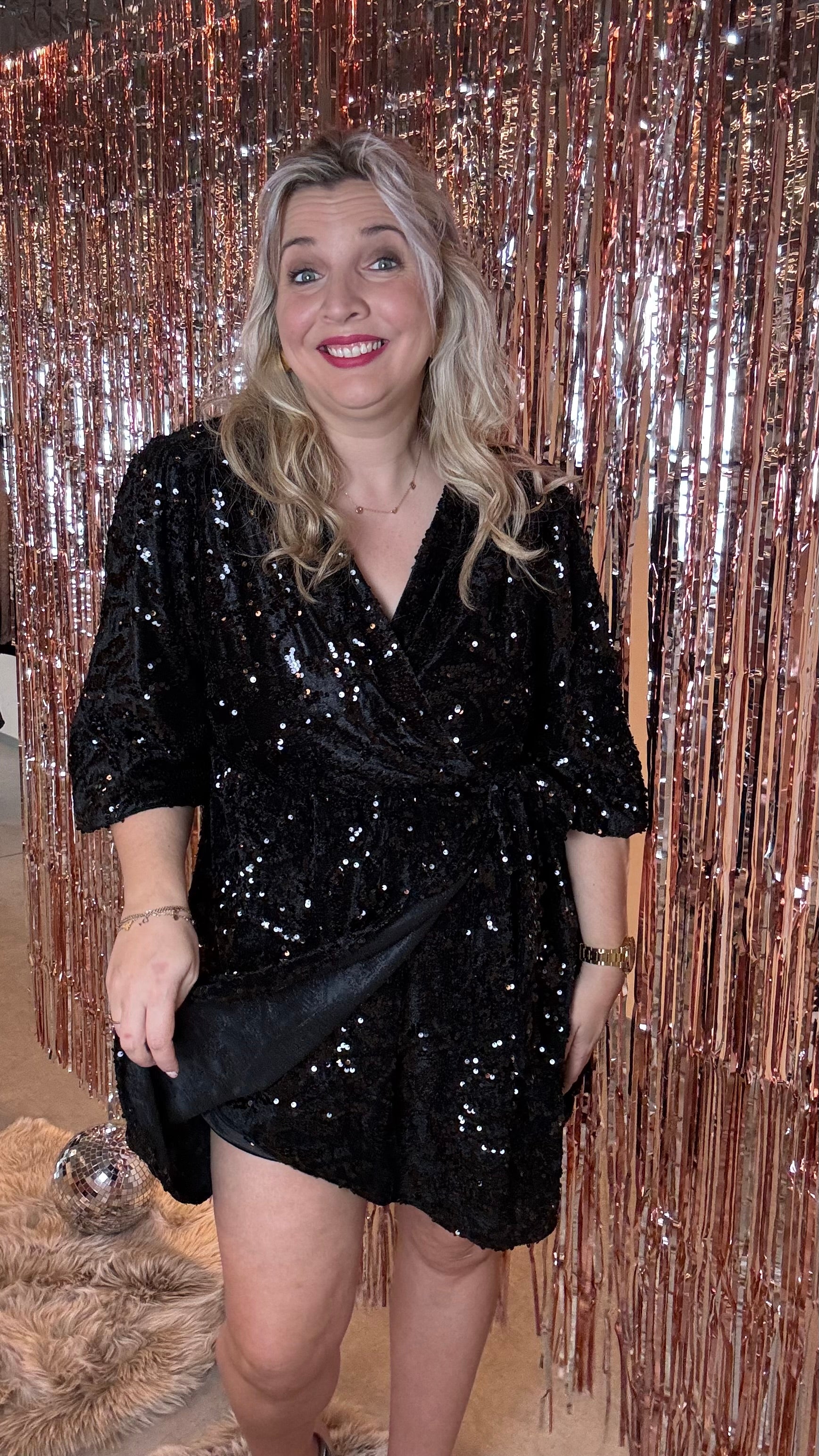 Klaar om te stralen? De Black Diamond Jurk is jouw ultieme party-outfit! Deze zwarte paillettenjurk glinstert bij elke beweging en heeft een flatterende overslag met schattige striklintjes aan de zijkant, zodat hij jouw silhouet prachtig omarmt. Het zwierige model geeft je elke stap een feestelijke touch — dansen, twisten, feesten… alles kan!