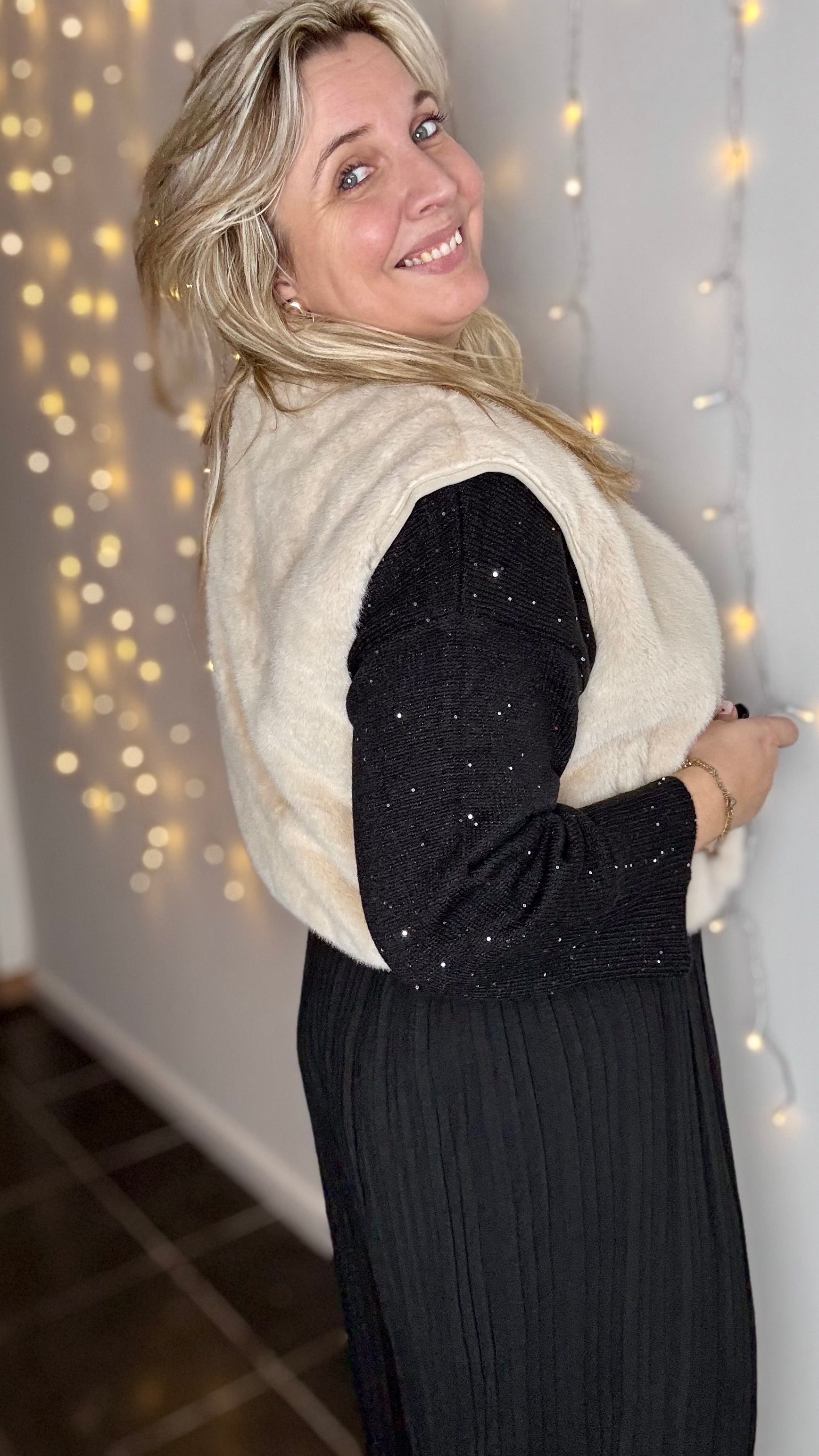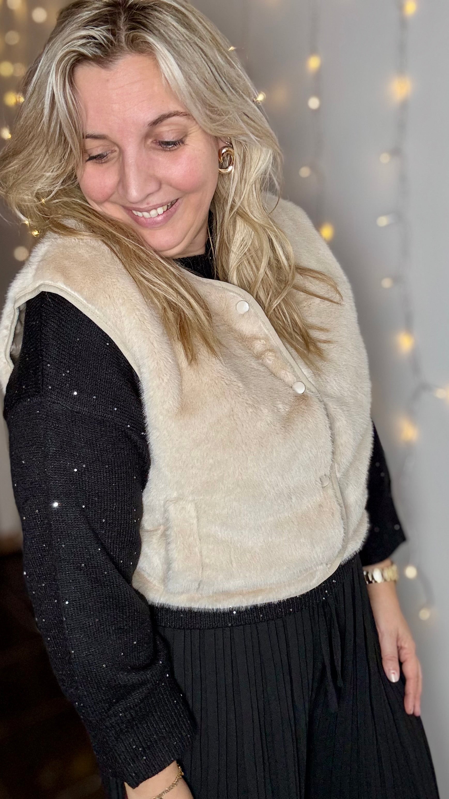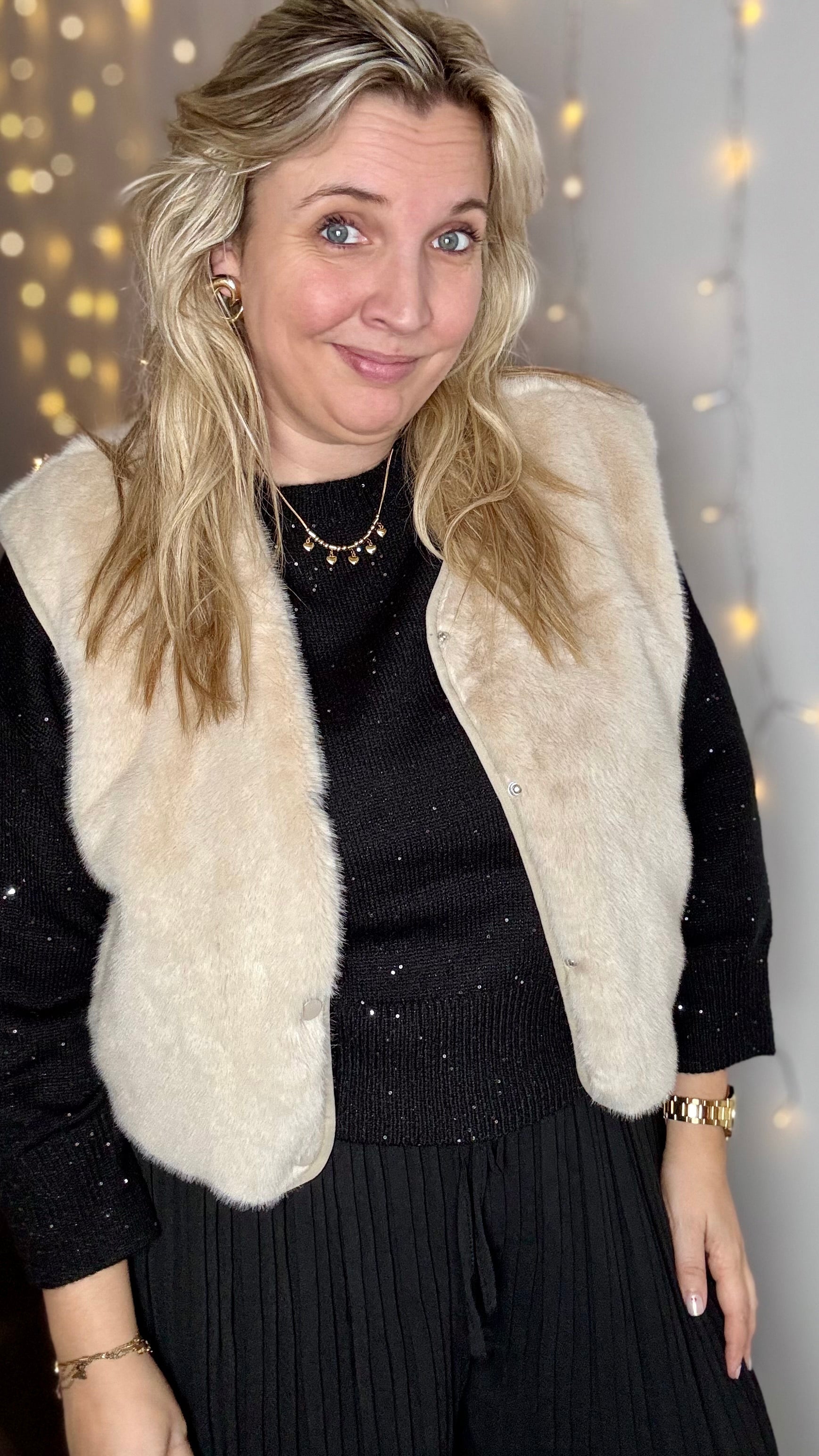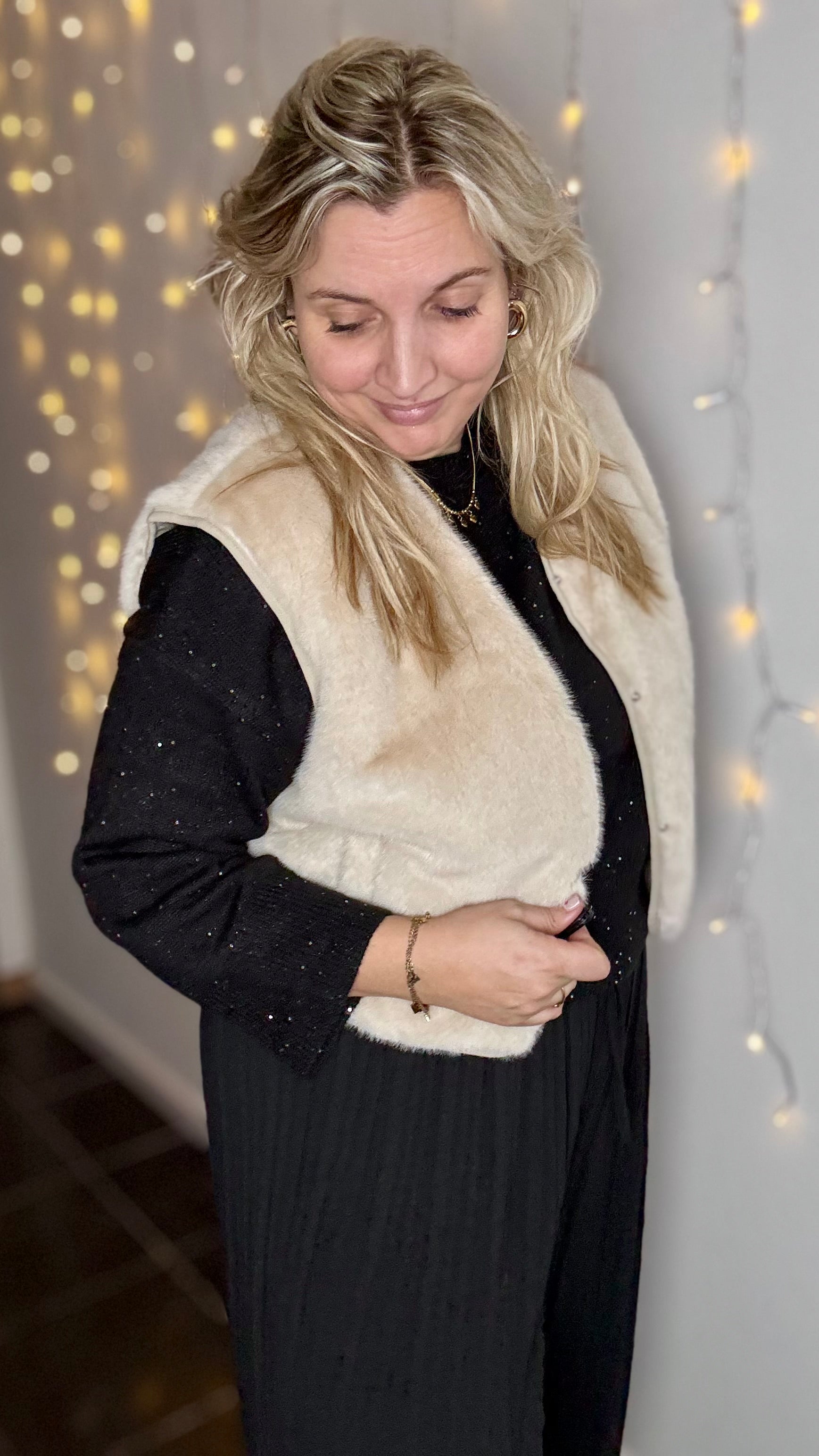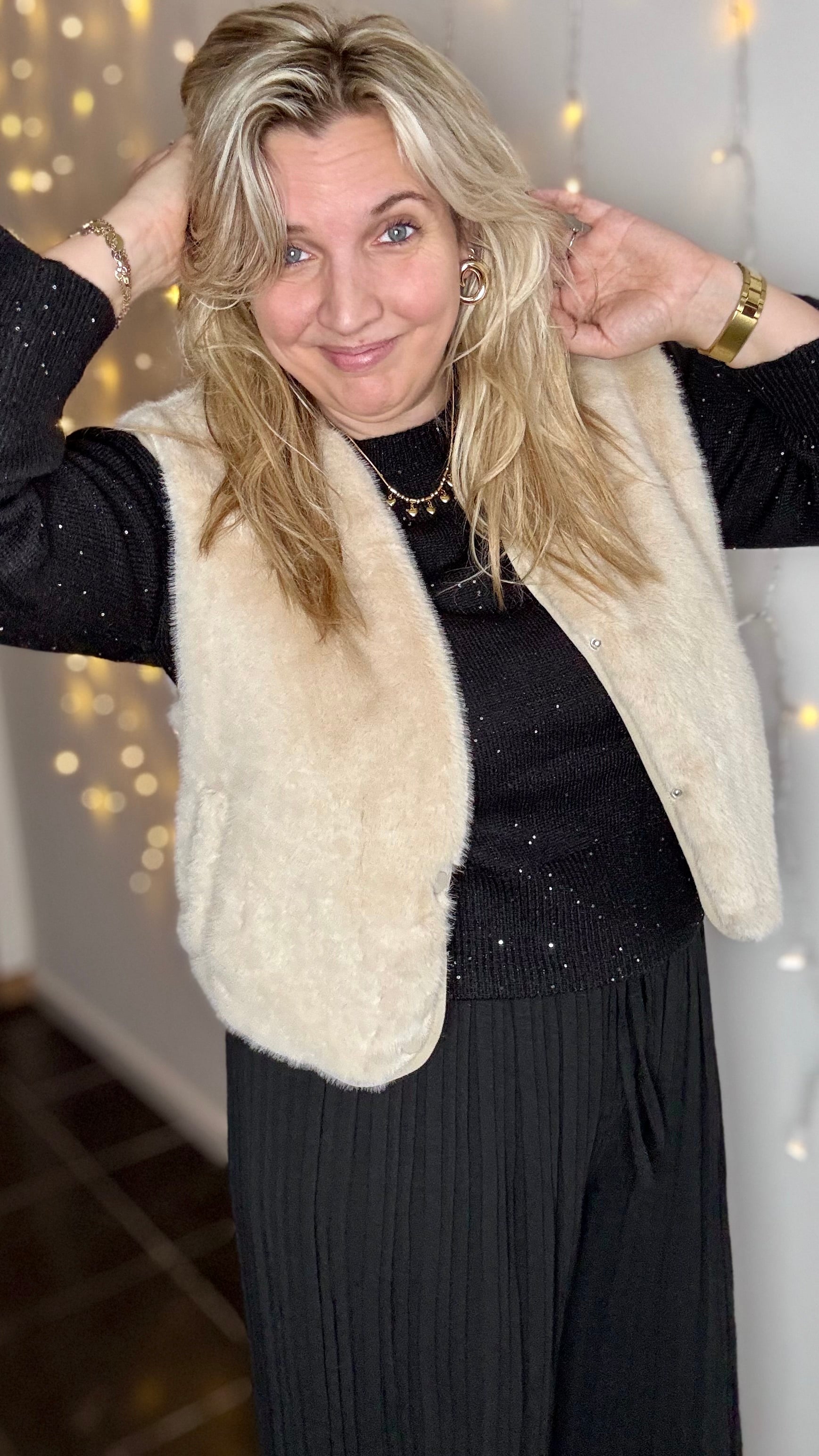 Een heerlijk zachte gilet in pelslook die meteen warmte en stijl toevoegt aan elke outfit. Ideaal om open te dragen over een trui, blouse of jurk voor een cozy maar trendy look.