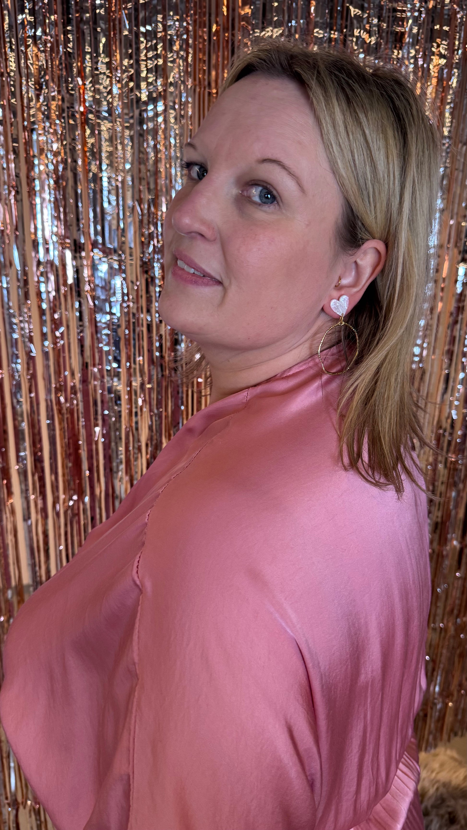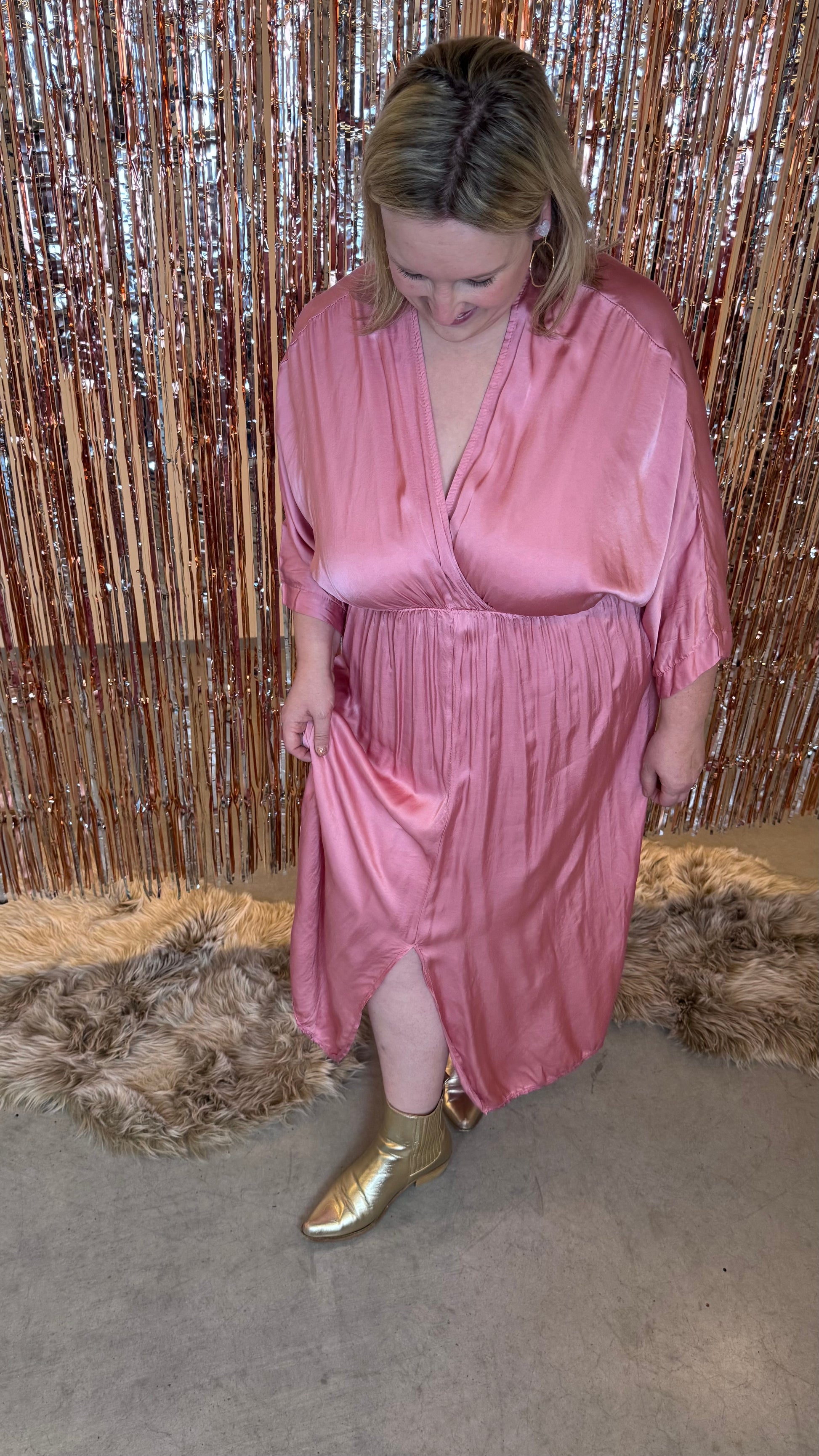 Zin in een vleugje elegantie? Deze vrouwelijke jurk in soepel satijn met een zachte V-hals en speelse, brede mouwen geeft je een instant classy look. Perfect voor feestjes, etentjes of gewoon wanneer je jezelf wil verwennen.