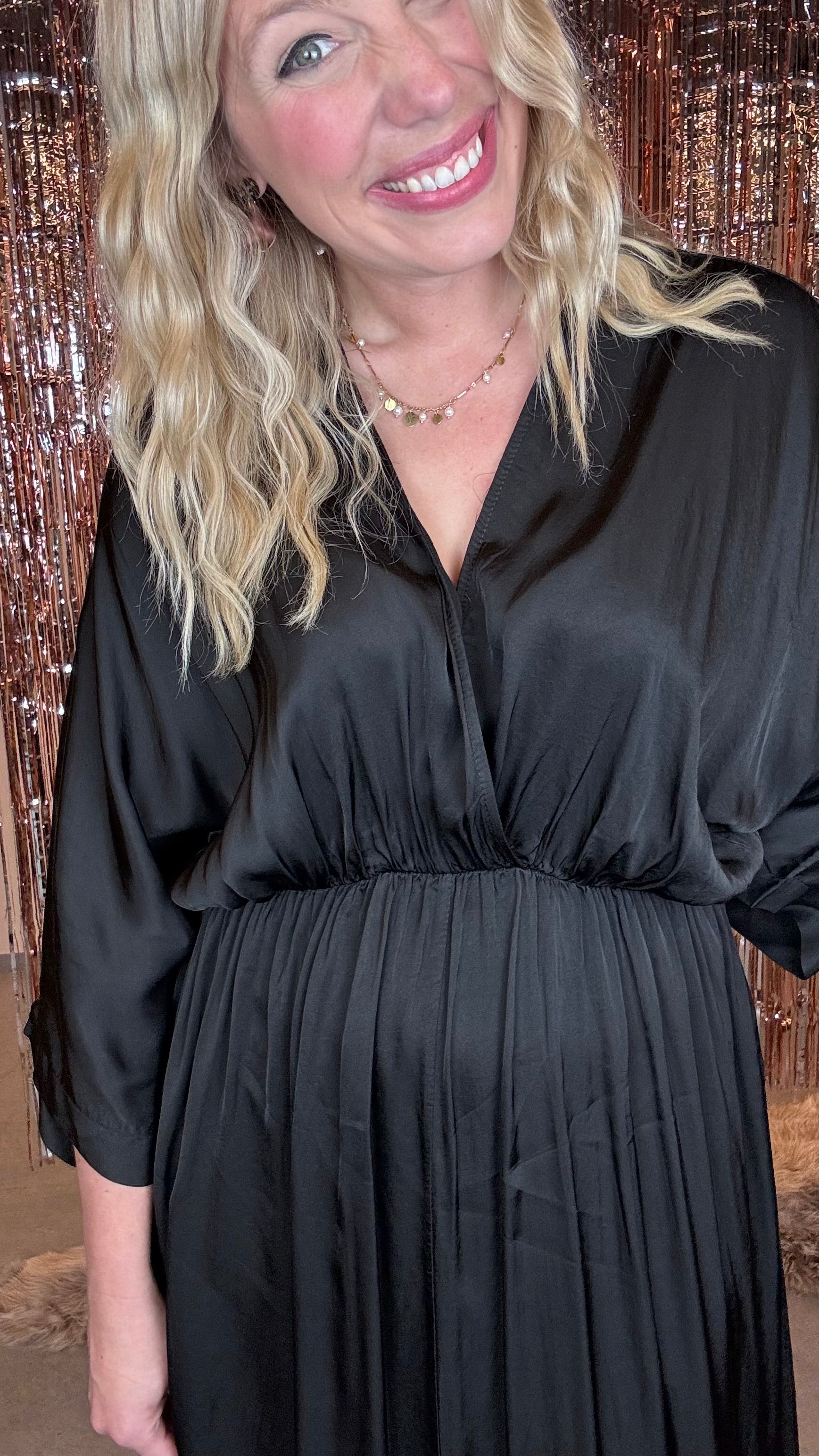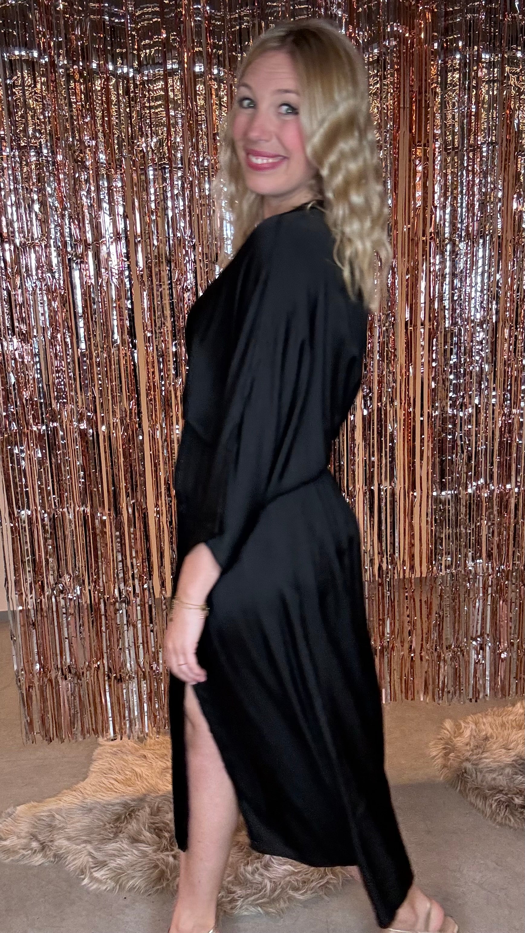 Zin in een vleugje elegantie? Deze vrouwelijke jurk in soepel satijn met een zachte V-hals en speelse, brede mouwen geeft je een instant classy look. Perfect voor feestjes, etentjes of gewoon wanneer je jezelf wil verwennen.