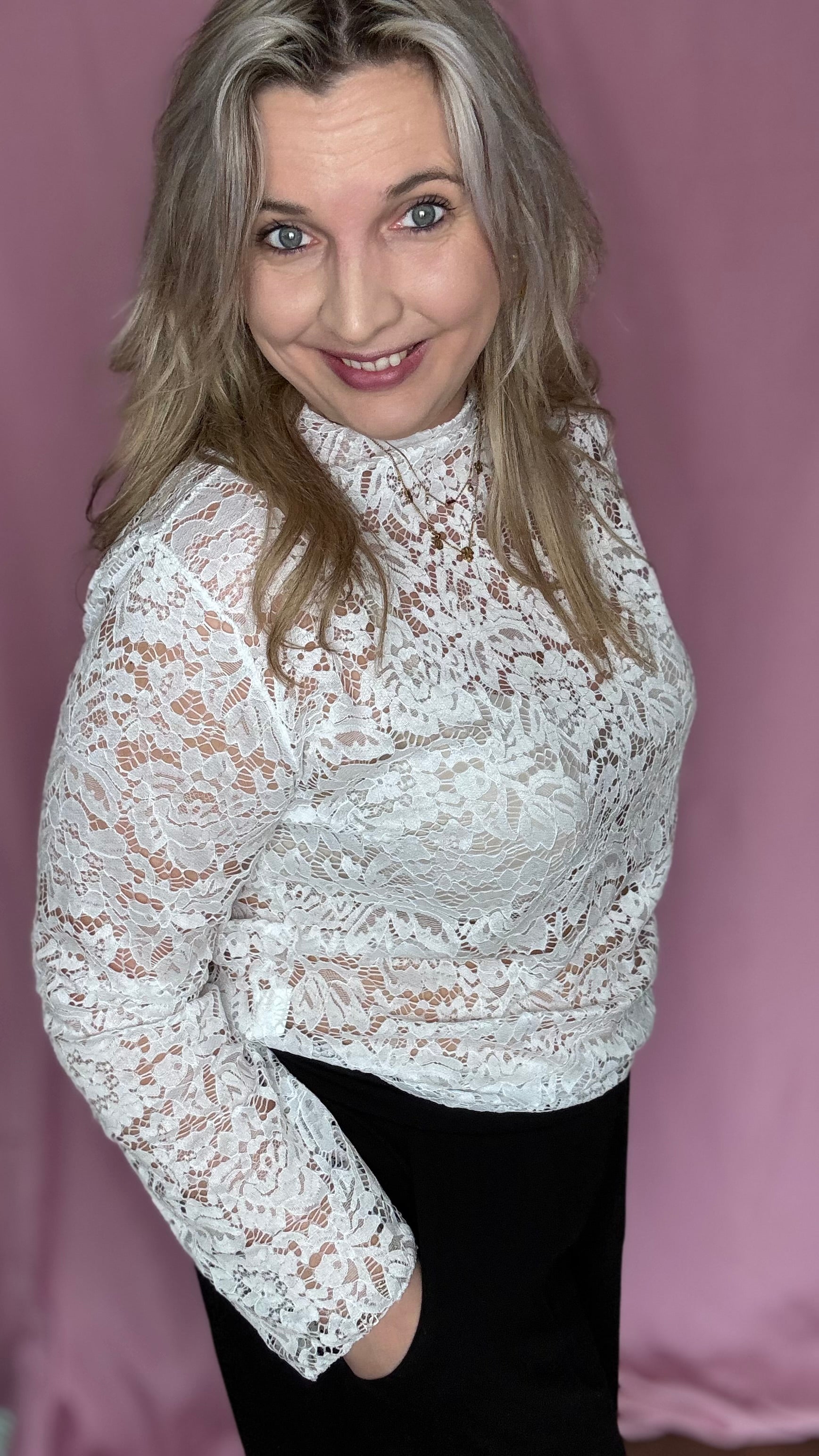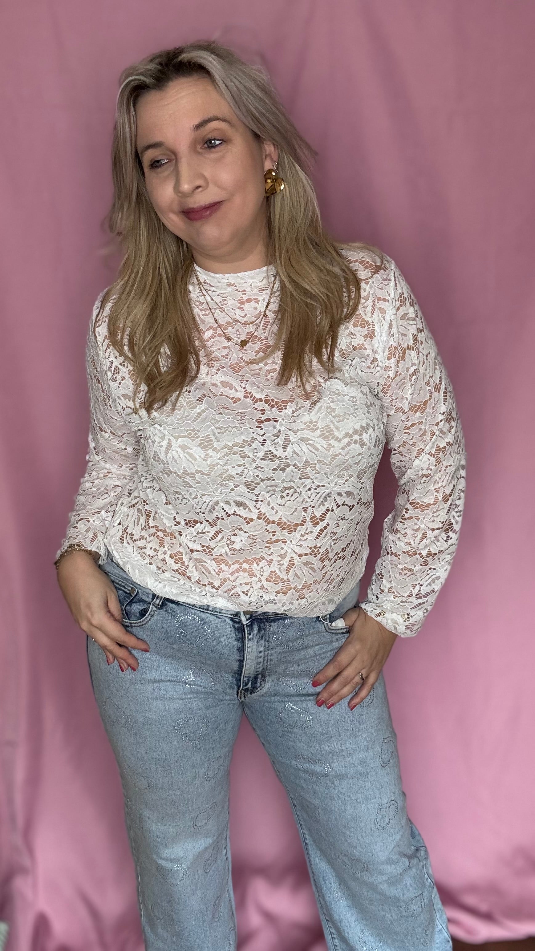 De Fleur Lace Blouse is een elegante kanten blouse met een verfijnd bloemenpatroon. De transparante stof, lange mouwen en ronde hals zorgen voor een vrouwelijke en stijlvolle uitstraling.