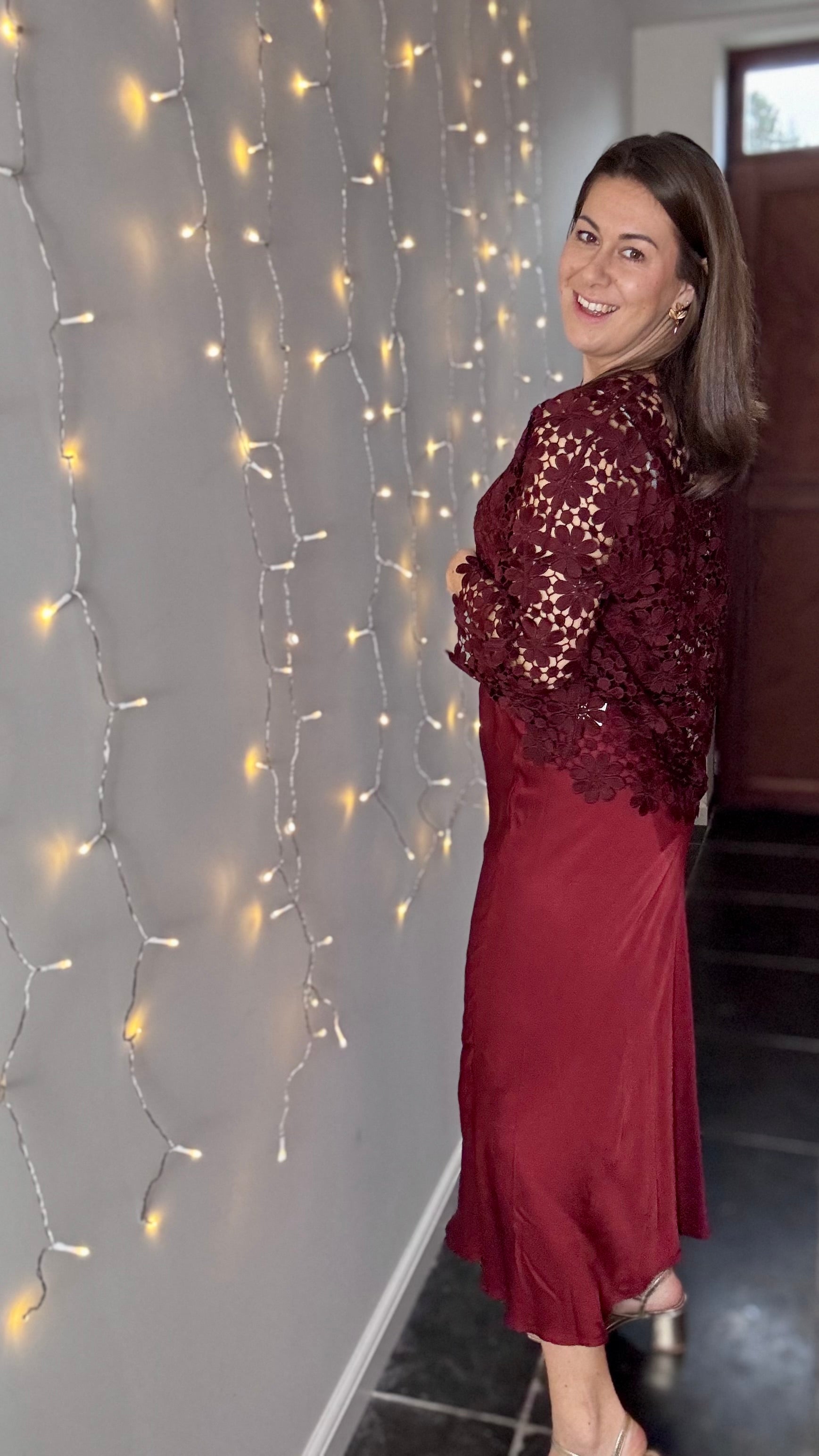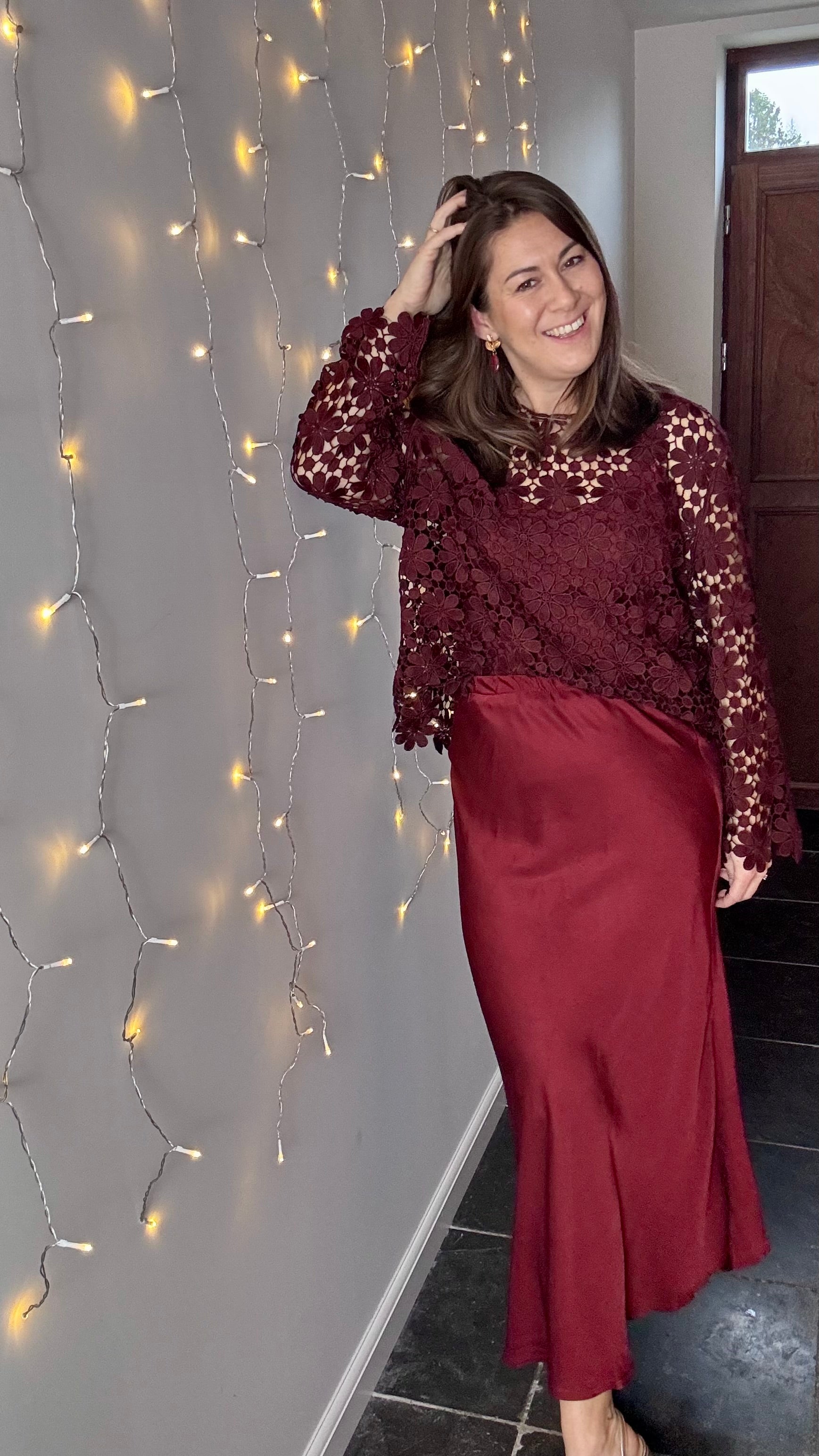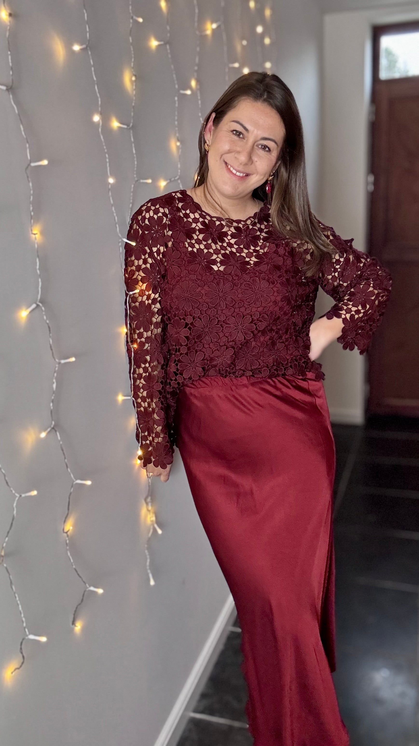 Elegante, lange rok in een flatterende snit: soepel, vrouwelijk en in een diepe wijnrode kleur. De stof valt mooi langs het lichaam en beweegt zacht mee bij elke stap.