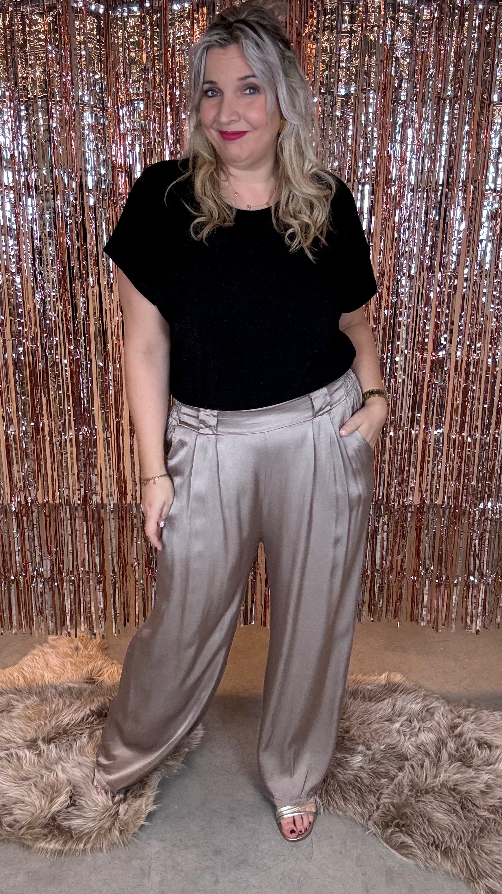 Deze vrouwelijke broek heeft een elastische taille, een wide & fluid cut en vooraan mooie plooien die je look meteen die extra touch geven. De zijzakken maken het model niet alleen elegant, maar ook superpraktisch.