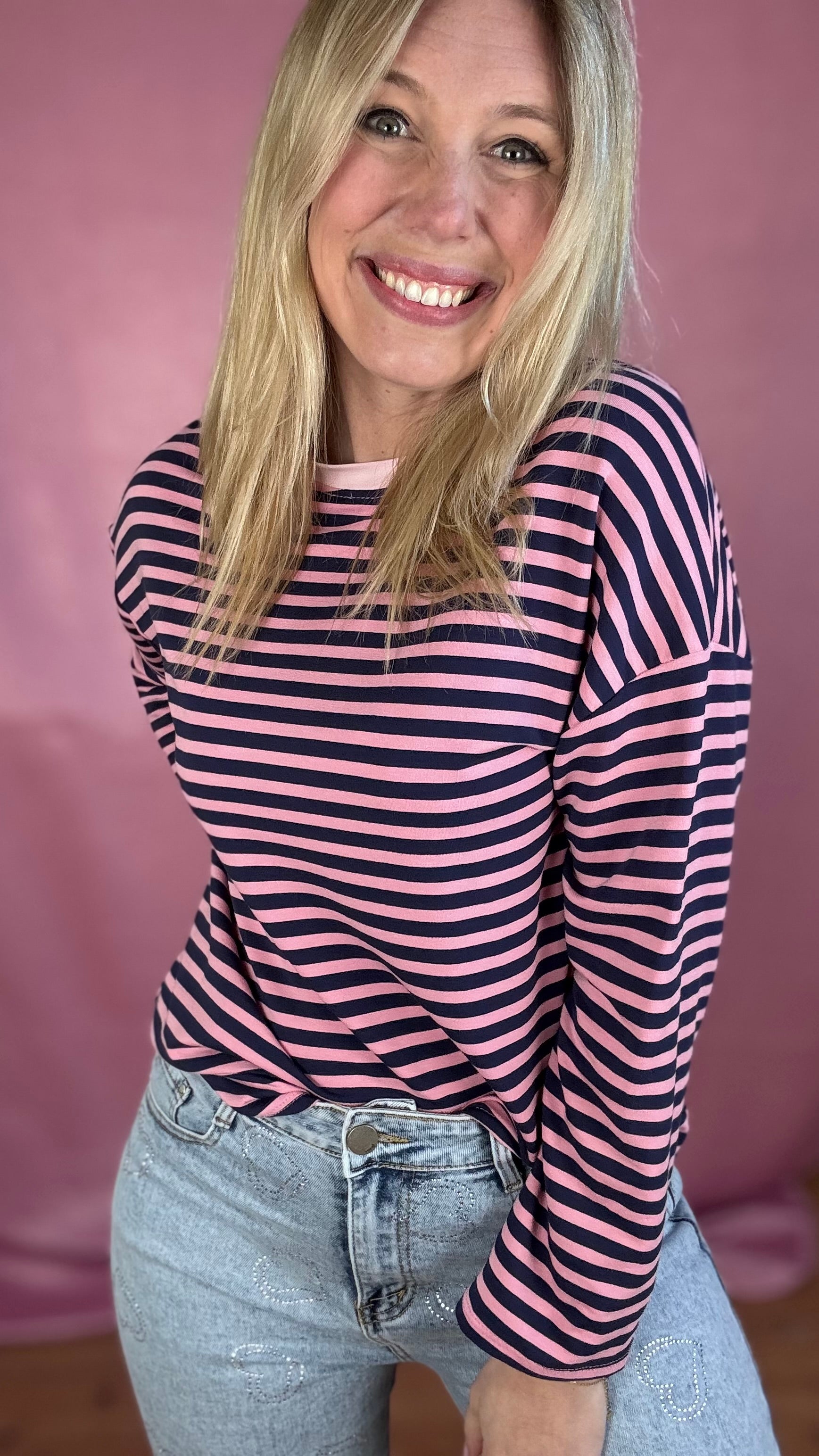 Happy stripes trui- navy/roze