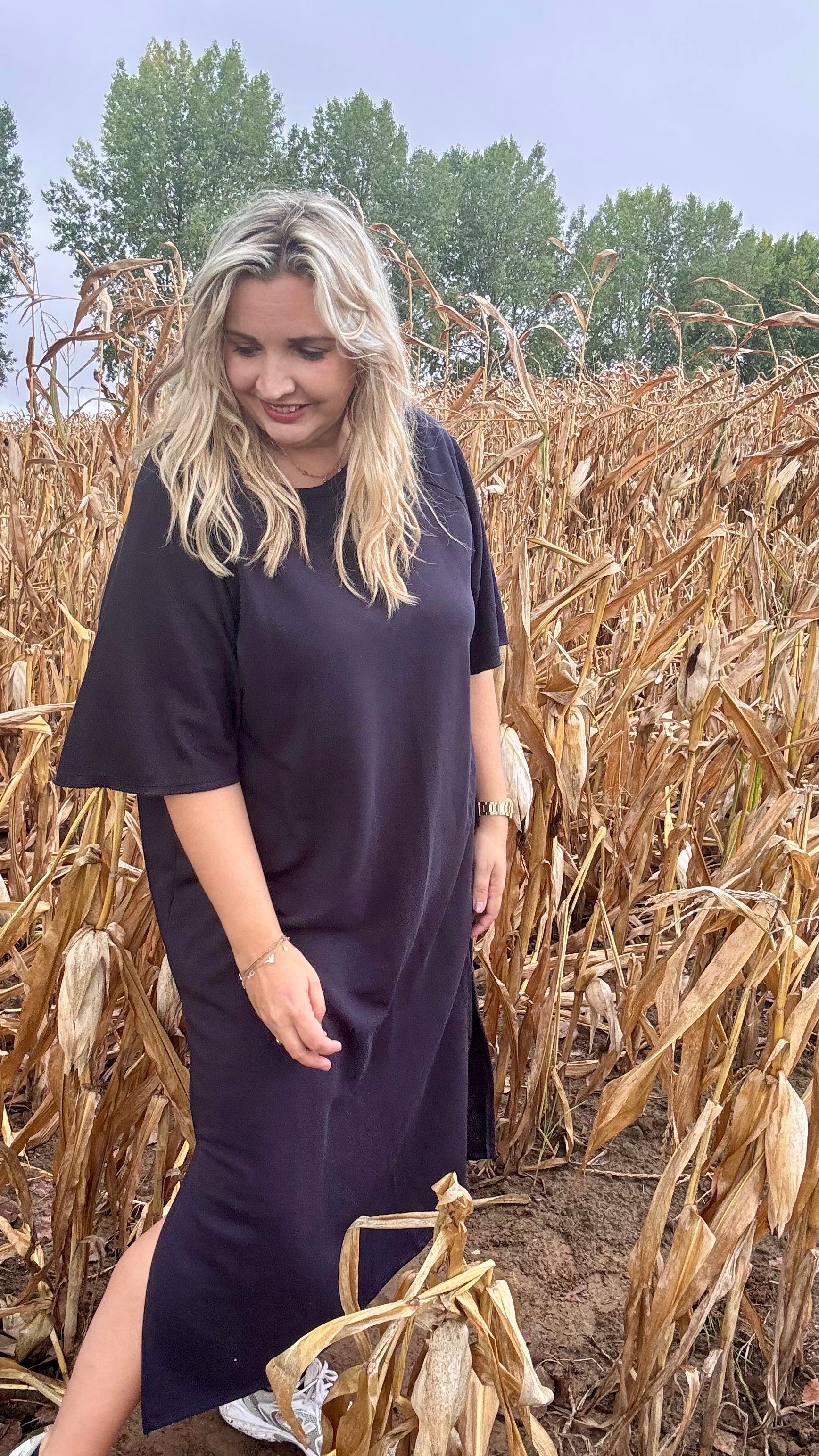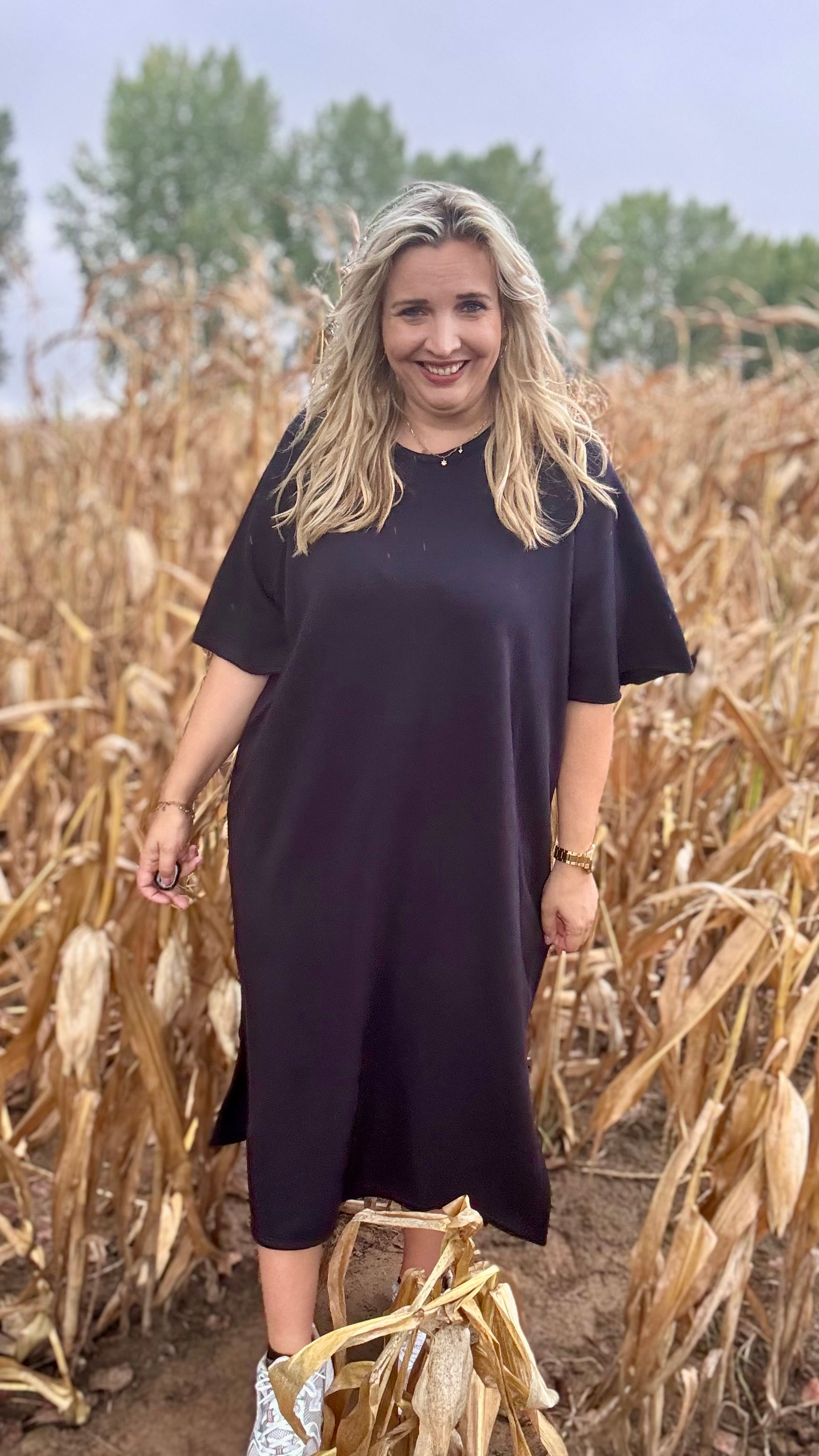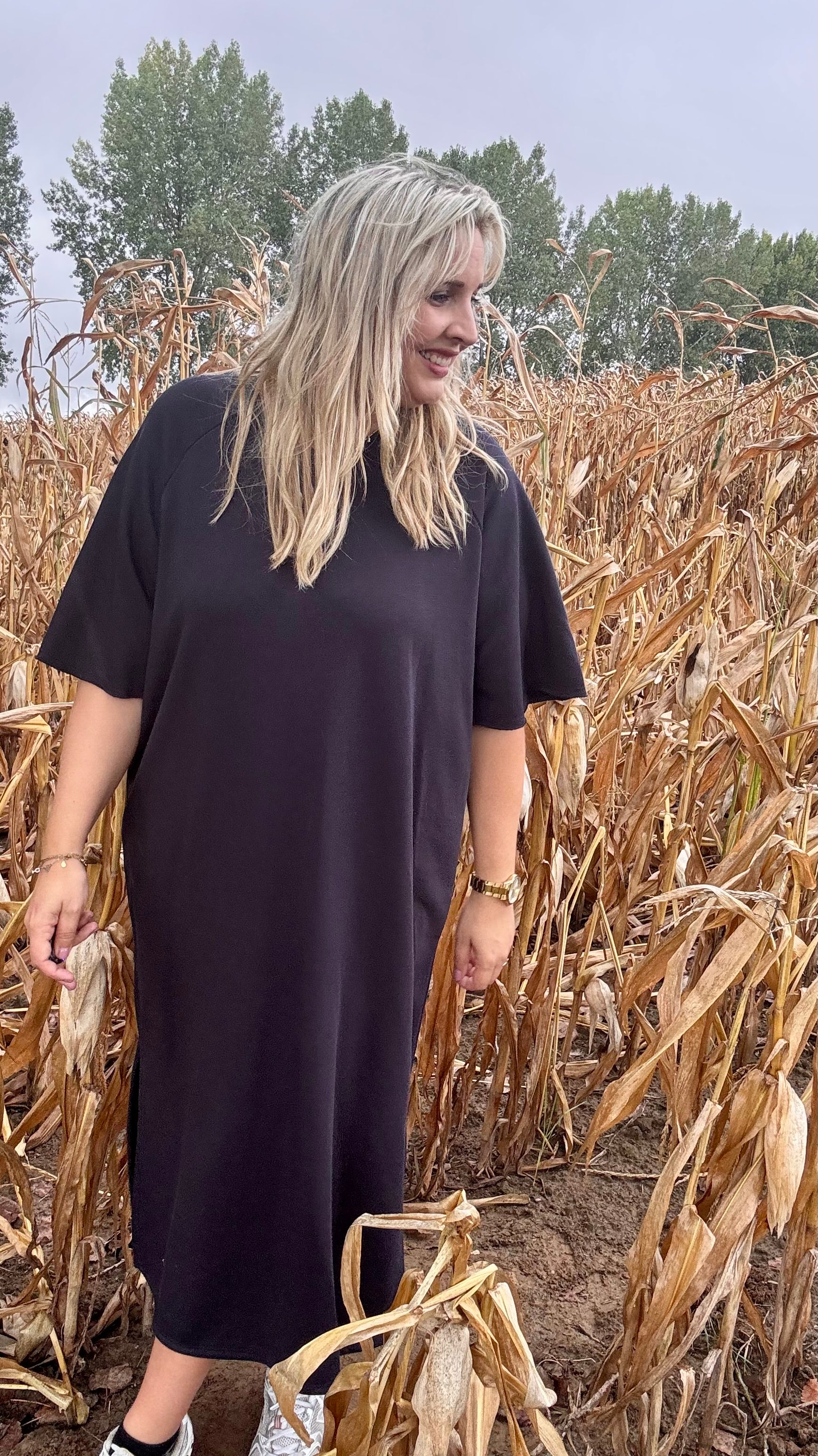 Zachte sweaterjurk in 100% katoen, perfect voor een relaxte dag thuis of gecombineerd met een gilet voor een stijlvolle herfstlook. Comfortabel, vrouwelijk en veelzijdig.