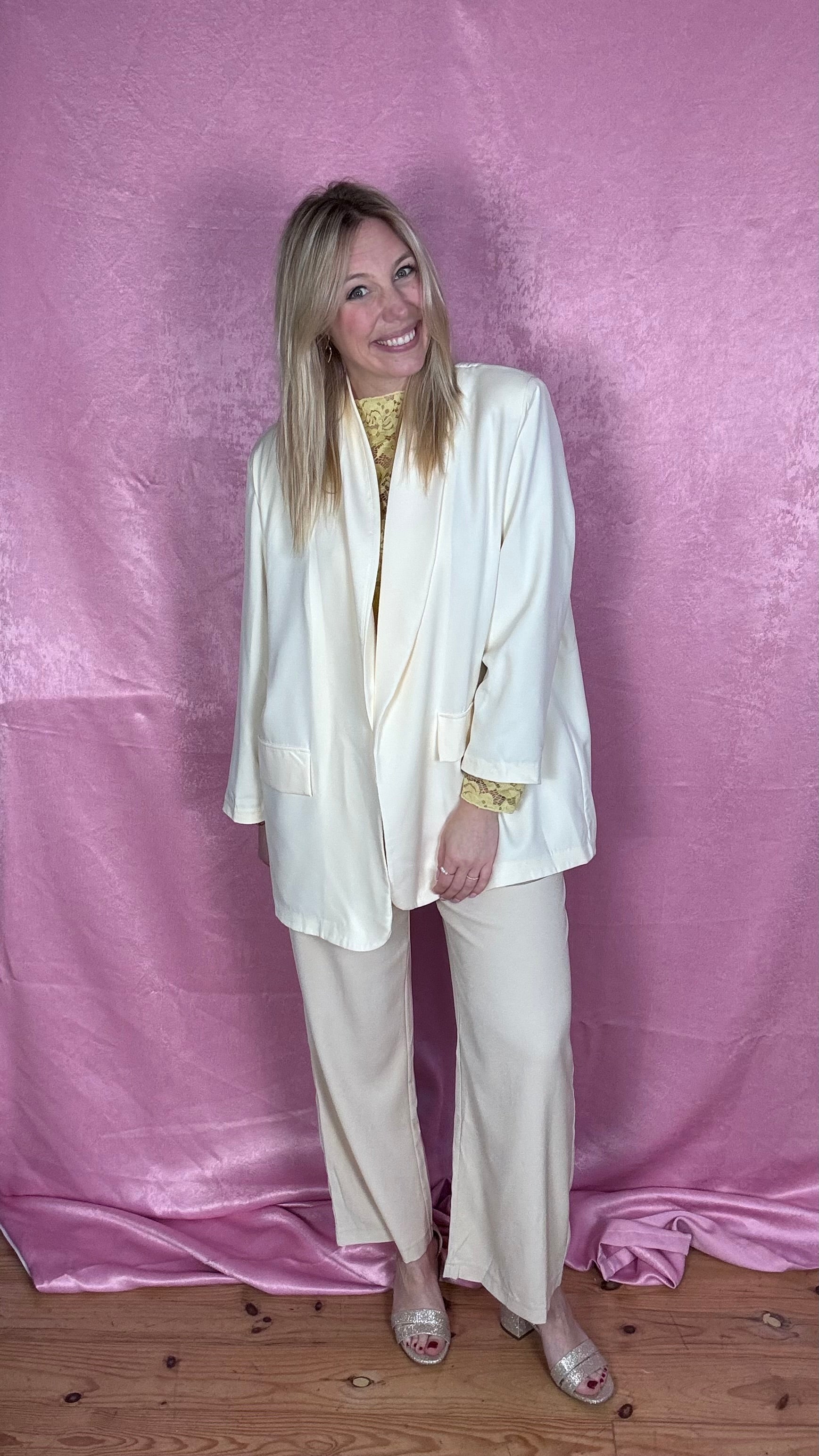 De blazer heeft geen echte zakken, maar de "show"-stiksels zorgen voor een moderne, verfijnde afwerking. Perfect voor een statement look die je zelfverzekerd maakt!