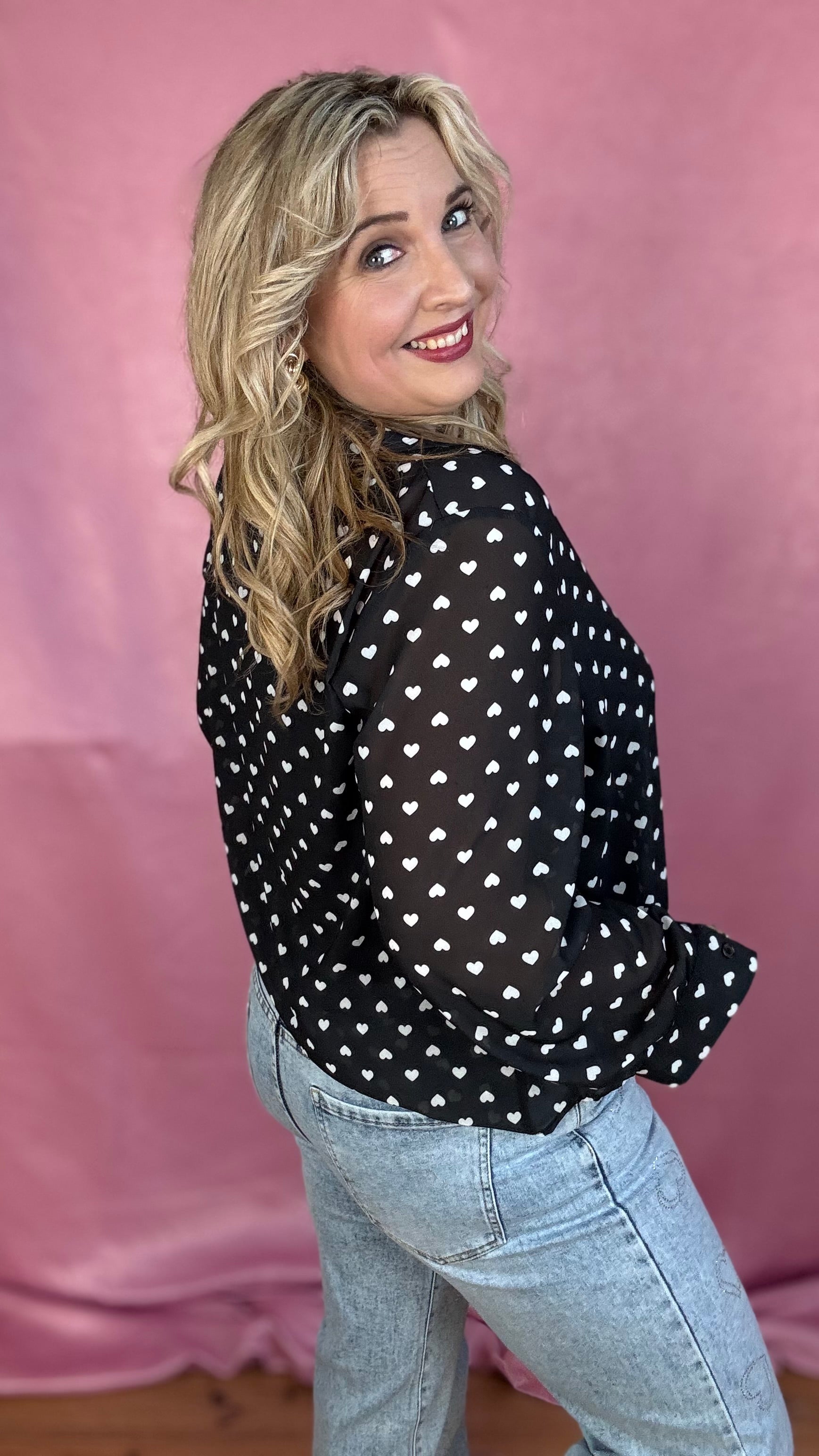 Licht transparante blouse met schattig hartjes-patroon.