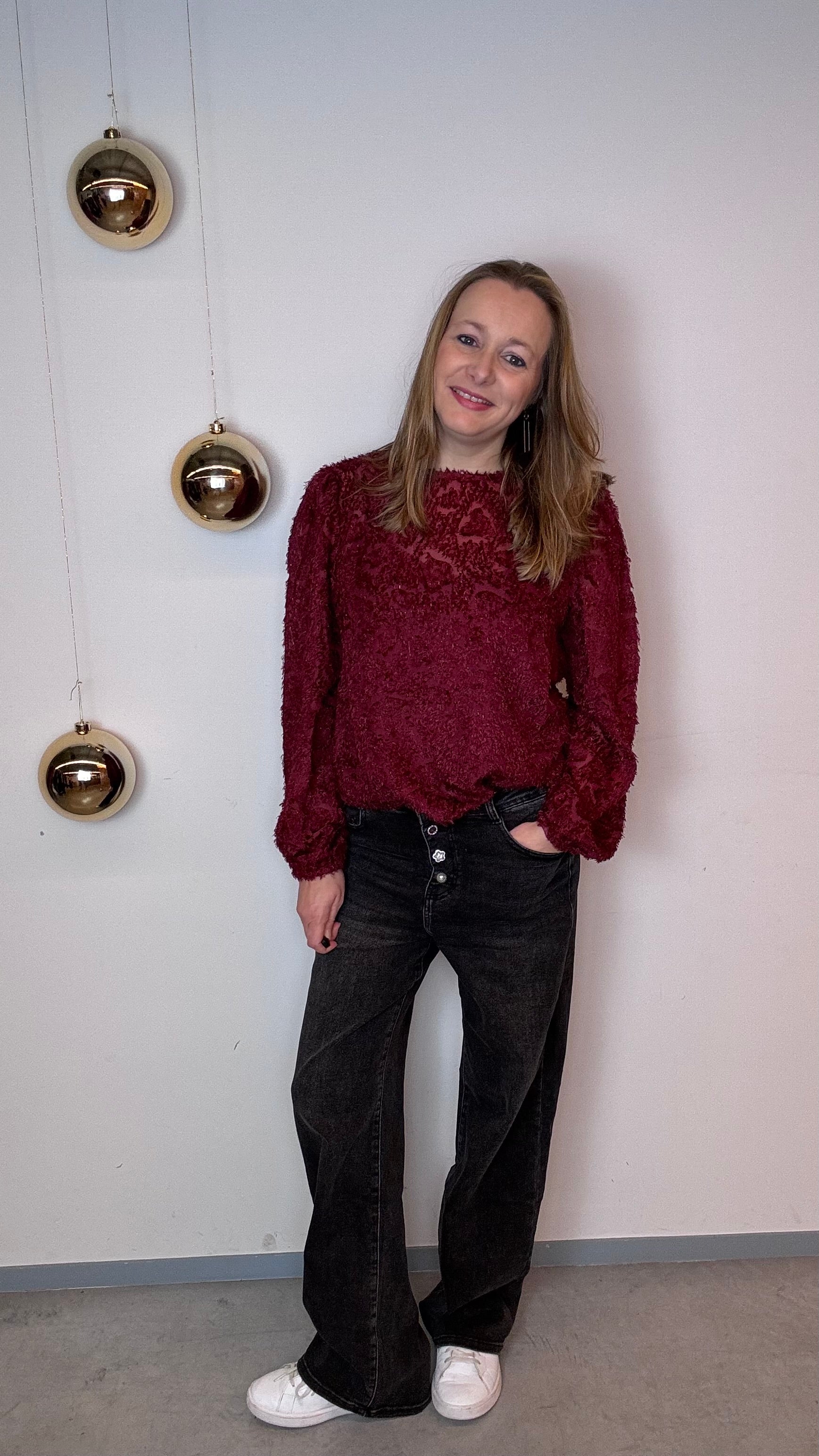 Ines – 162 cm – draagt maat 48, zit mooi aansluitend.