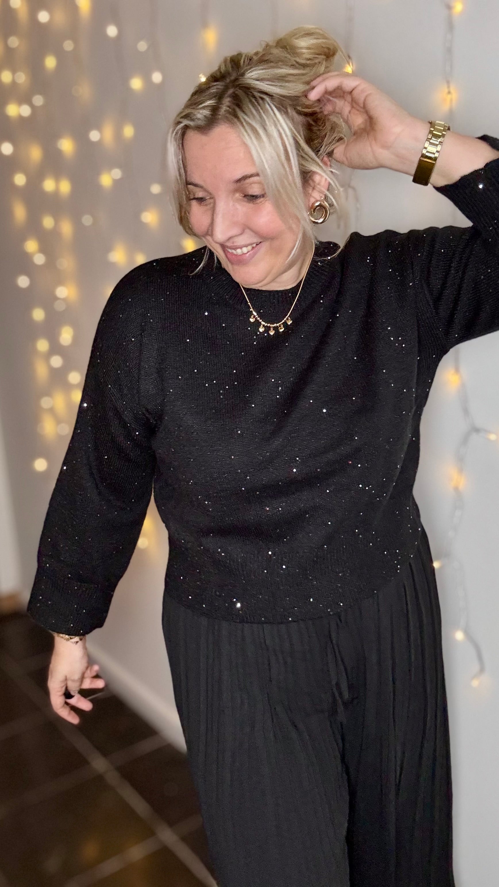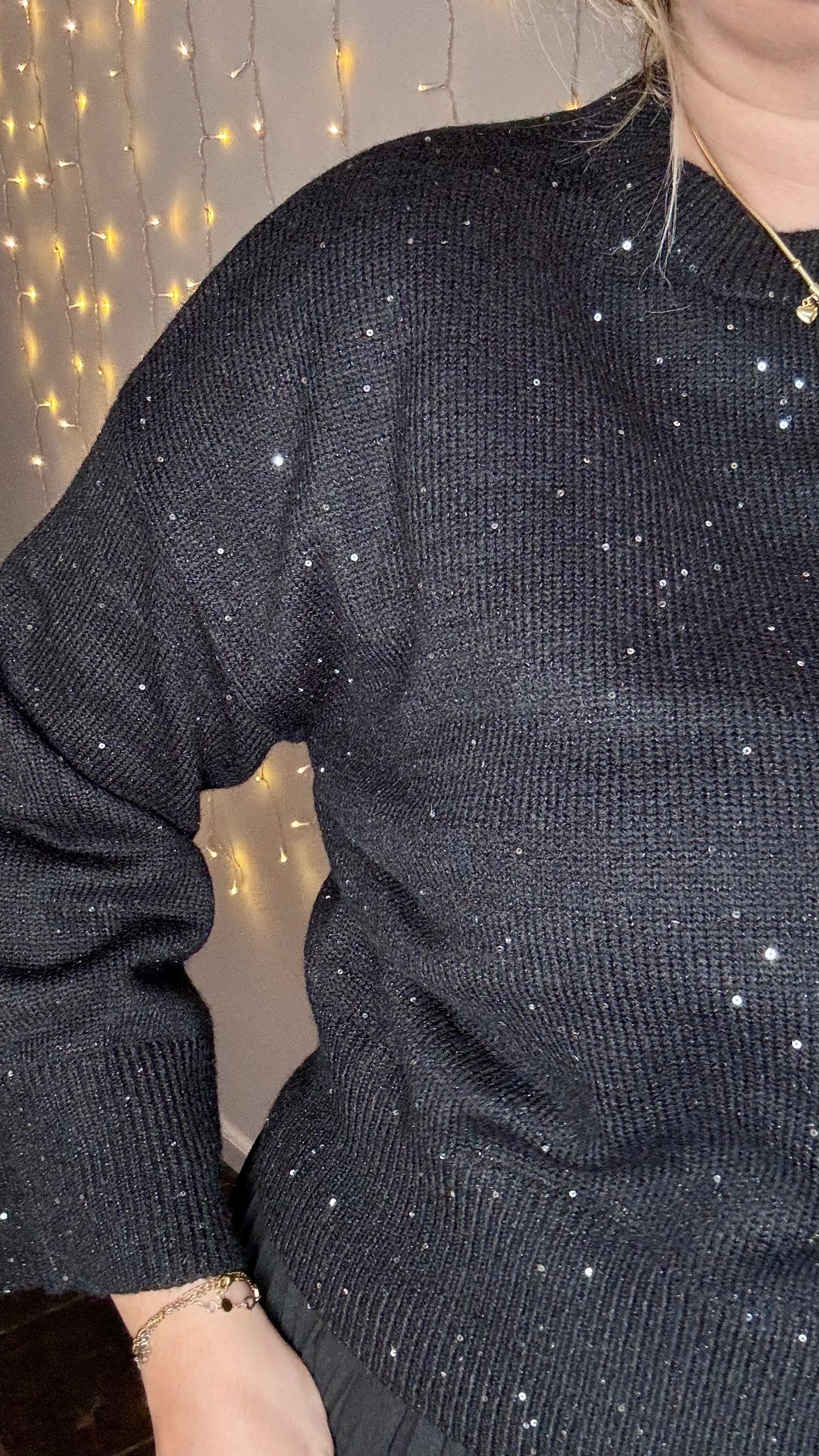 Een zachte zwarte trui met een fijne, subtiele glitter die zorgt voor een elegante sparkle zonder te overheersen. Makkelijk te combineren en perfect voor zowel everyday looks als feestelijke momenten.