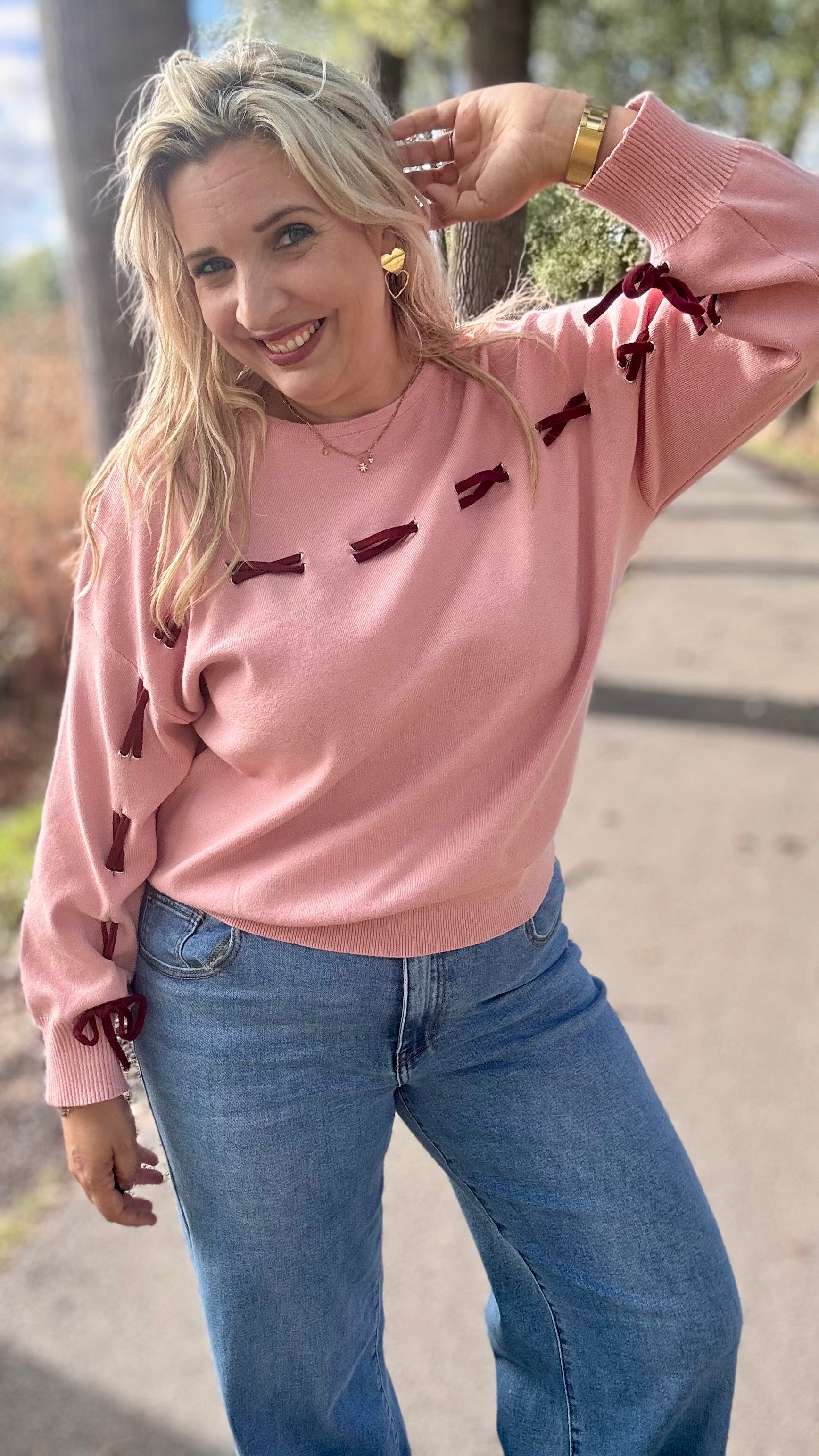 Deze trui valt op maat en valt meteen op door de veter die in een kruissteek doorheen de trui loopt. Kleine, schattige strikjes aan de pols maken het geheel extra charmant. Perfect voor wie een speelse touch wil toevoegen aan een cozy look.