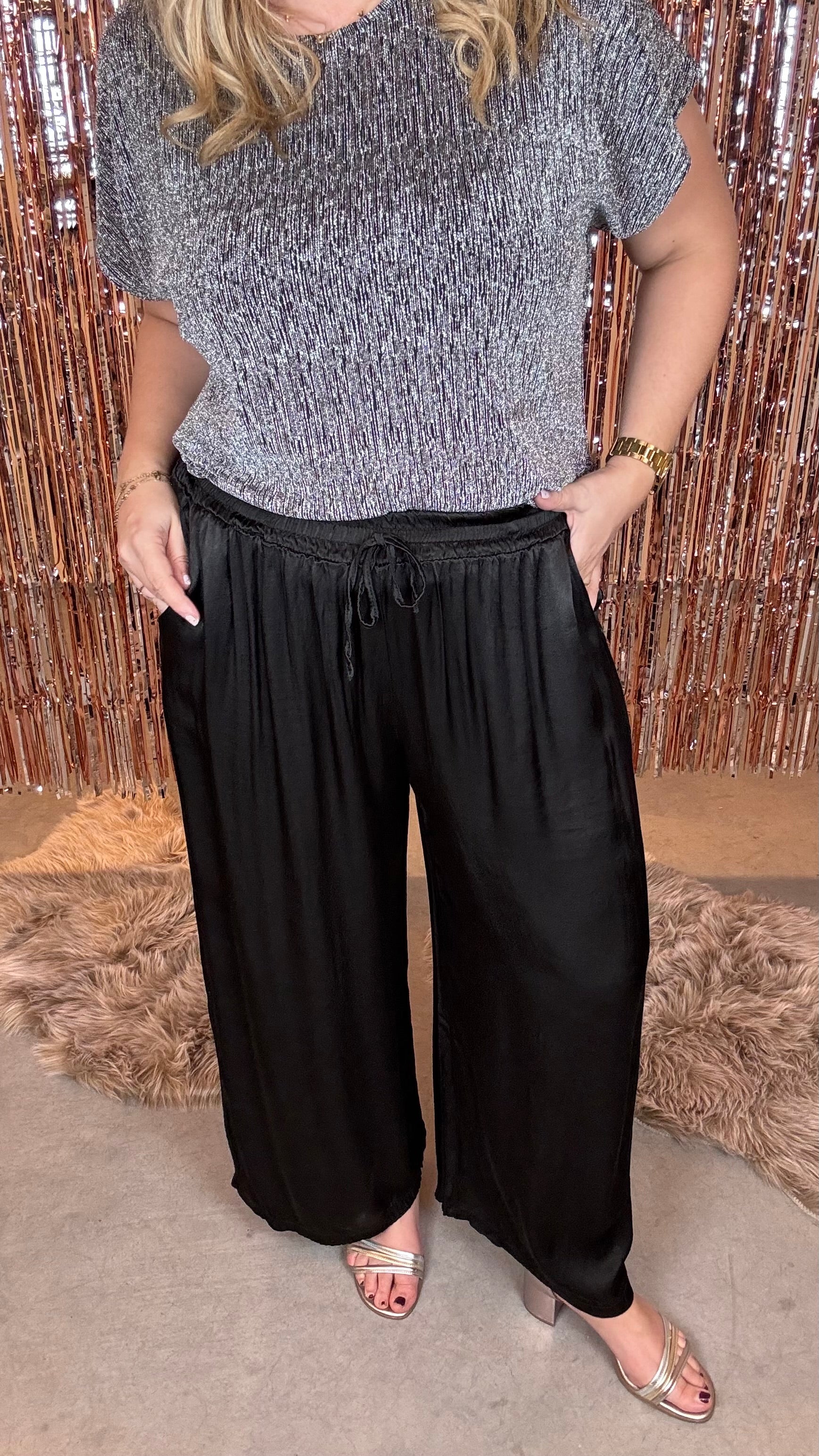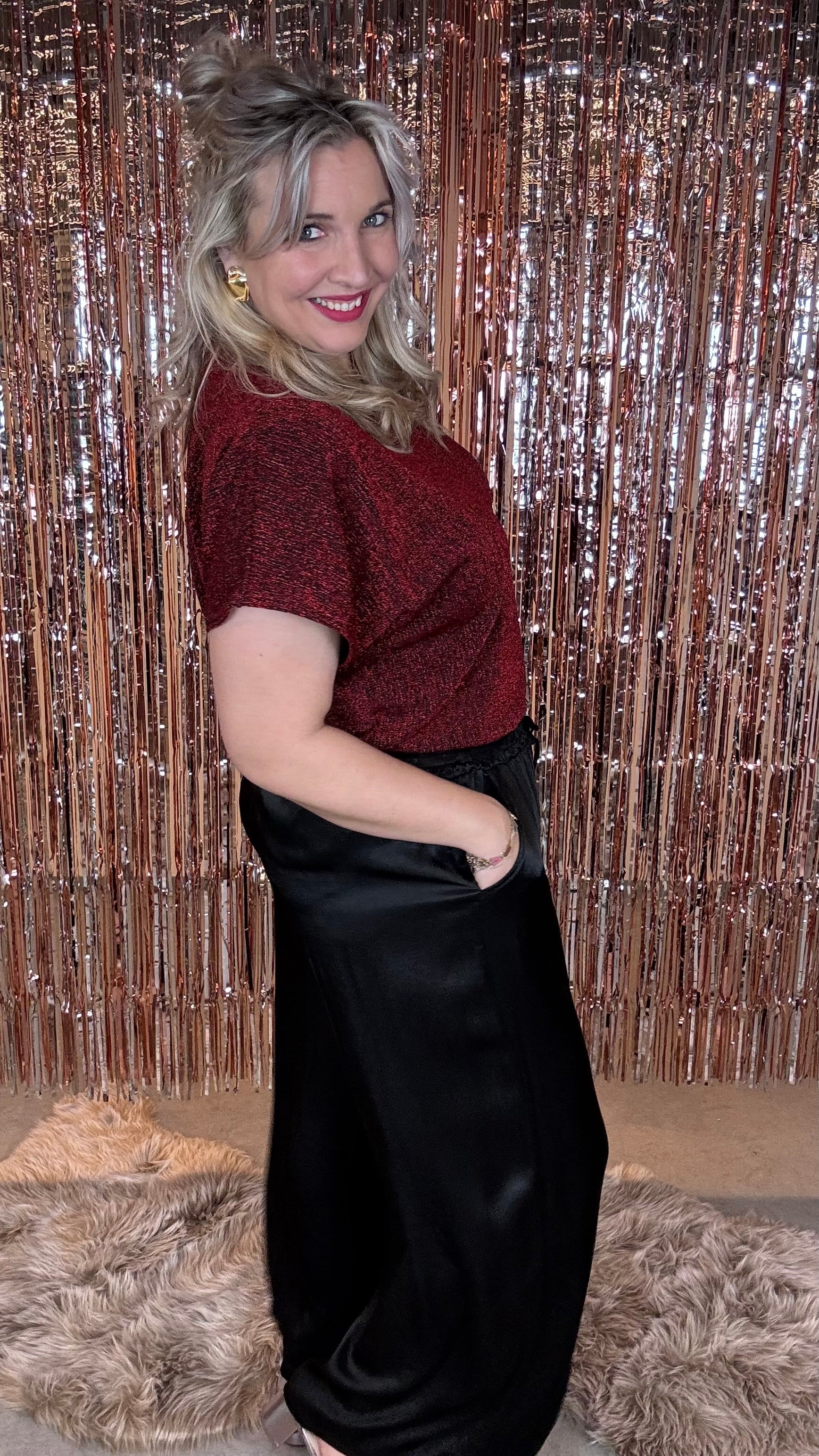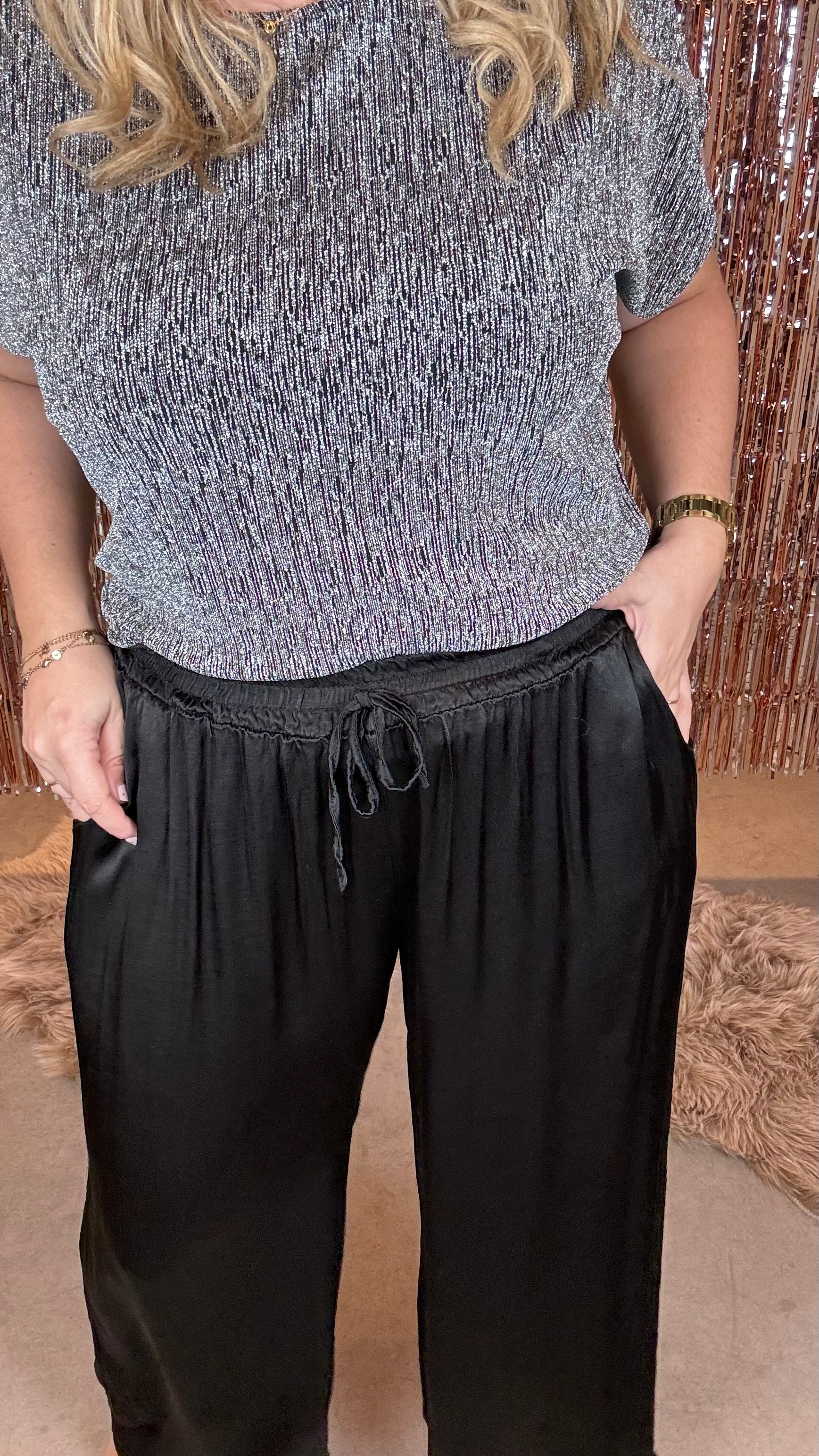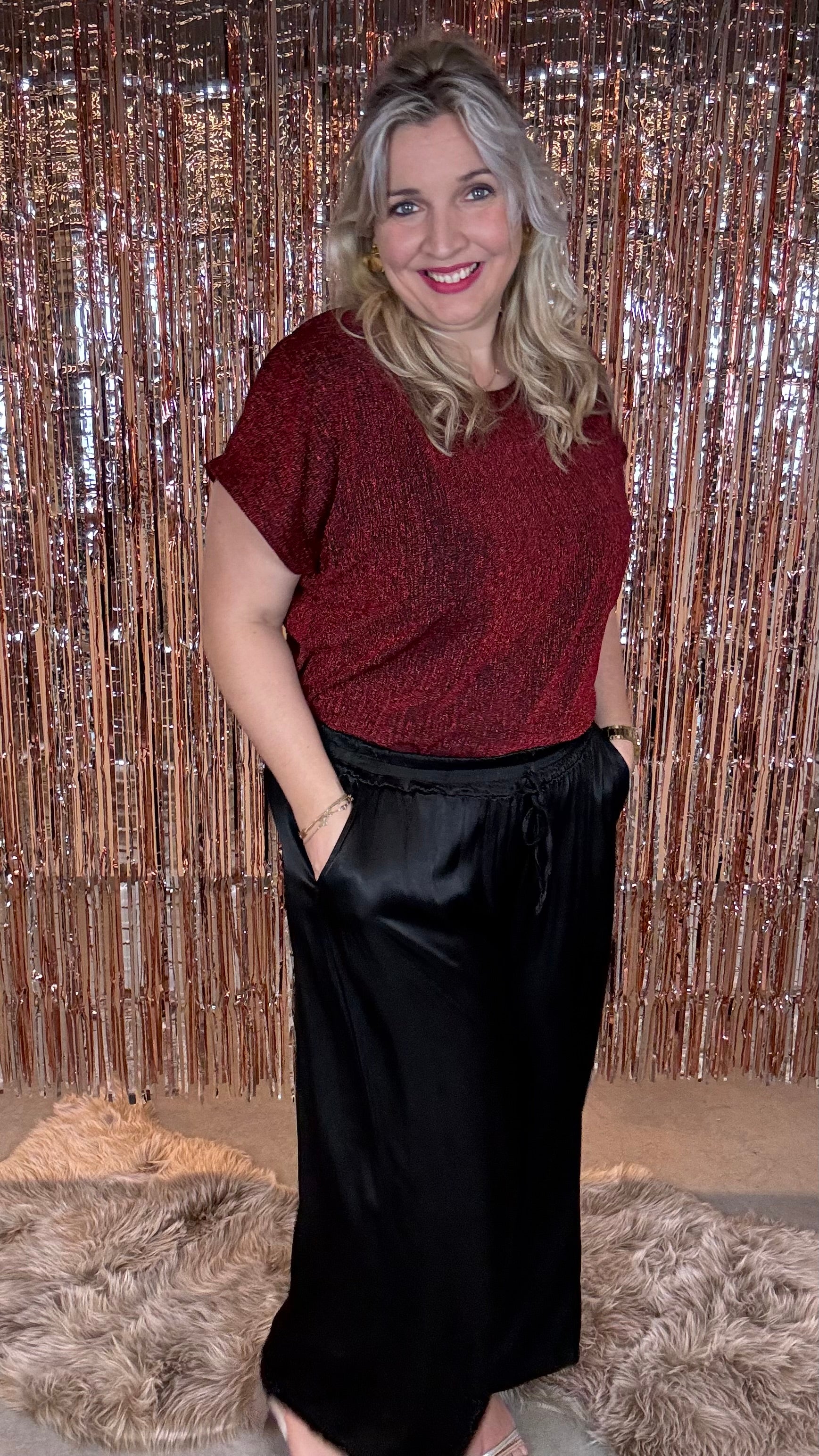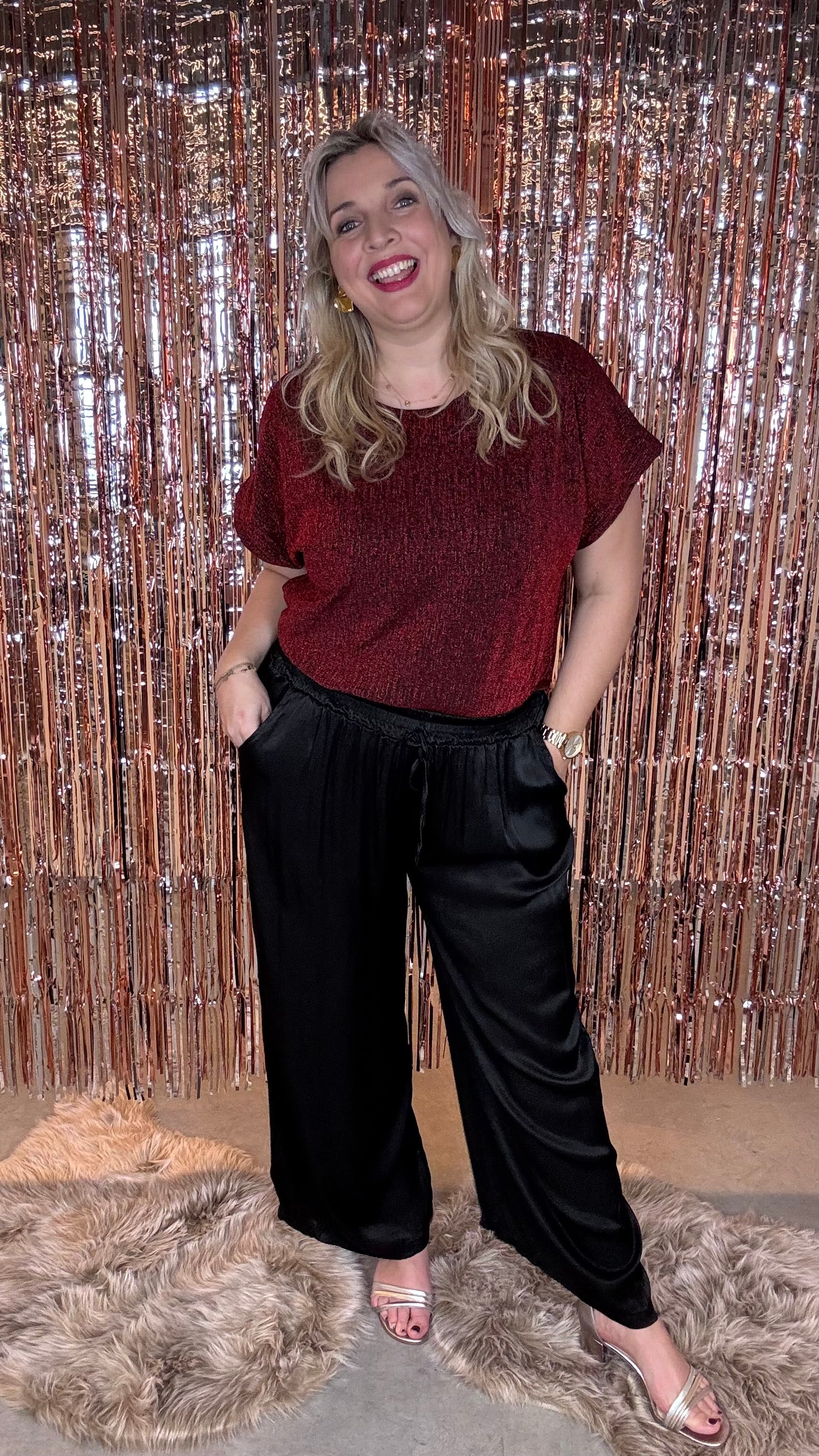 Prachtige, glanzende fluid broek die elegant valt en toch zalig zit. De elastische taille zorgt voor comfort, terwijl de 100% viscose stof licht en luchtig aanvoelt. Jouw nieuwe favoriete broek voor zowel casual als chique looks.